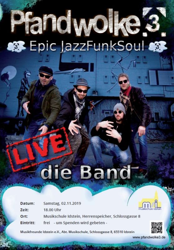 Im Rahmen der Sonderveranstaltungen im fünfzigsten Jubiläumsjahr lädt die Musikschule nun am Samstag, 2. November um 18.00 Uhr in den Saal des Herrenspeichers in der Schlossgasse 8 zu einem spannenden Livekonzert ein. Die vier Musiker werden das Publikum mit einem eigenen bunten Stilmix unterhalten, den die Band in der Besetzung Saxophon, Gitarre/Bass, Hammond Orgel und Drums kreiert. Neben dem eigenen Repertoire, instrumentaler Kompositionen und Improvisationen, schrecken sie nicht davor zurück, auch Opernarien zu adaptieren. Die junge Band aus Wiesbaden bedient sich dabei Elementen aus Funk, Jazz, Blues, Rock, Latin und Crossover und verbindet diese zu einem ganz eigenen und einzigartigen Sound. Wer neugierig geworden ist und sich umfassender über die Band informieren oder vorab ein paar Kostproben hören möchte, wird hierzu auf der Homepage www.pfandwolke3.de fündig.